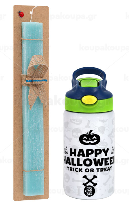 Happy Halloween pumpkin, Πασχαλινή Λαμπάδα με Παιδικό παγούρι θερμό, ανοξείδωτο, με καλαμάκι ασφαλείας, πράσινο/μπλε (350ml) & κερί αρωματικό πλακέ (30cm) (ΤΙΡΚΟΥΑΖ)