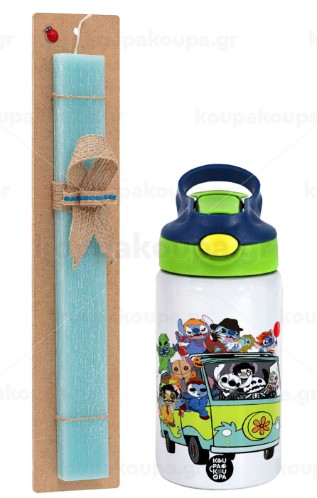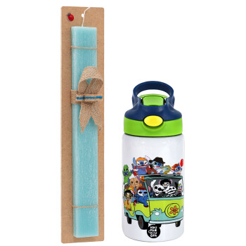 Stitch Halloween scooby car, Πασχαλινή Λαμπάδα με Παιδικό παγούρι θερμό, ανοξείδωτο, με καλαμάκι ασφαλείας, πράσινο/μπλε (350ml) & κερί αρωματικό πλακέ (30cm) (ΤΙΡΚΟΥΑΖ)