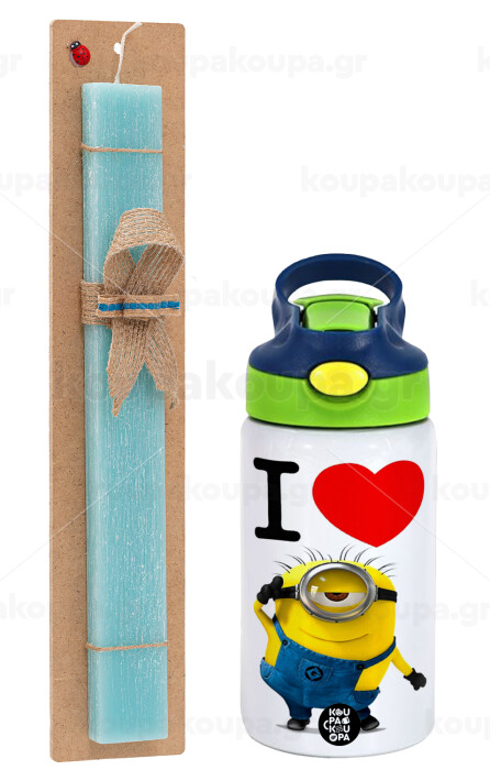 I love by minion, Πασχαλινή Λαμπάδα με Παιδικό παγούρι θερμό, ανοξείδωτο, με καλαμάκι ασφαλείας, πράσινο/μπλε (350ml) & κερί αρωματικό πλακέ (30cm) (ΤΙΡΚΟΥΑΖ)