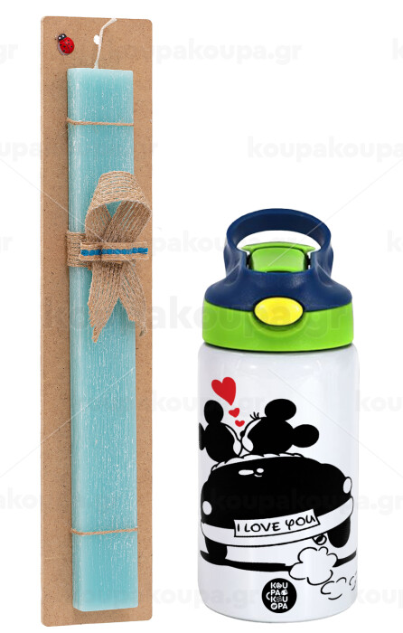 Love Car, Πασχαλινή Λαμπάδα με Παιδικό παγούρι θερμό, ανοξείδωτο, με καλαμάκι ασφαλείας, πράσινο/μπλε (350ml) & κερί αρωματικό πλακέ (30cm) (ΤΙΡΚΟΥΑΖ)