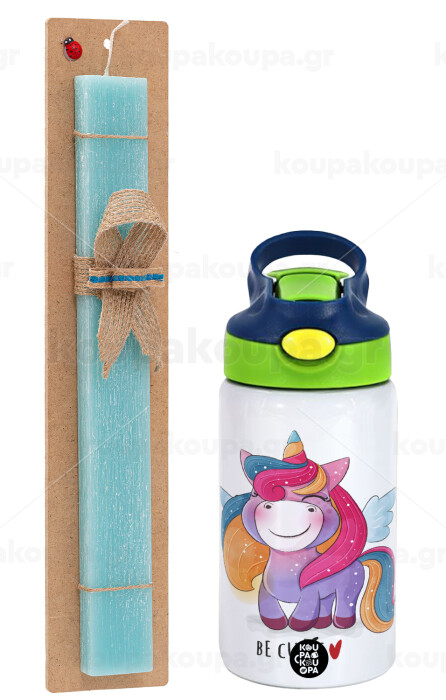 Μονόκερος, Πασχαλινή Λαμπάδα με Παιδικό παγούρι θερμό, ανοξείδωτο, με καλαμάκι ασφαλείας, πράσινο/μπλε (350ml) & κερί αρωματικό πλακέ (30cm) (ΤΙΡΚΟΥΑΖ)