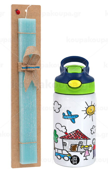 Παιδική ζωγραφιά, Πασχαλινή Λαμπάδα με Παιδικό παγούρι θερμό, ανοξείδωτο, με καλαμάκι ασφαλείας, πράσινο/μπλε (350ml) & κερί αρωματικό πλακέ (30cm) (ΤΙΡΚΟΥΑΖ)