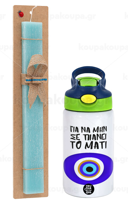 Για να μην σε πιάνει το μάτι, Πασχαλινή Λαμπάδα με Παιδικό παγούρι θερμό, ανοξείδωτο, με καλαμάκι ασφαλείας, πράσινο/μπλε (350ml) & κερί αρωματικό πλακέ (30cm) (ΤΙΡΚΟΥΑΖ)