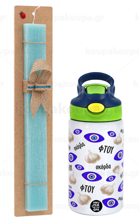 Φτου, φτου, σκόρδα!!!, Πασχαλινή Λαμπάδα με Παιδικό παγούρι θερμό, ανοξείδωτο, με καλαμάκι ασφαλείας, πράσινο/μπλε (350ml) & κερί αρωματικό πλακέ (30cm) (ΤΙΡΚΟΥΑΖ)