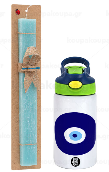 Χάντρα γαλαζιά, Πασχαλινή Λαμπάδα με Παιδικό παγούρι θερμό, ανοξείδωτο, με καλαμάκι ασφαλείας, πράσινο/μπλε (350ml) & κερί αρωματικό πλακέ (30cm) (ΤΙΡΚΟΥΑΖ)