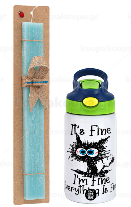 Cat, It's Fine I'm Fine Everything Is Fine, Πασχαλινή Λαμπάδα με Παιδικό παγούρι θερμό, ανοξείδωτο, με καλαμάκι ασφαλείας, πράσινο/μπλε (350ml) & κερί αρωματικό πλακέ (30cm) (ΤΙΡΚΟΥΑΖ)