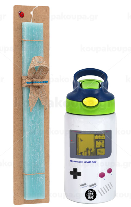 Gameboy, Πασχαλινή Λαμπάδα με Παιδικό παγούρι θερμό, ανοξείδωτο, με καλαμάκι ασφαλείας, πράσινο/μπλε (350ml) & κερί αρωματικό πλακέ (30cm) (ΤΙΡΚΟΥΑΖ)