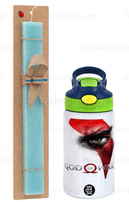 God of war Stratos, Πασχαλινή Λαμπάδα με Παιδικό παγούρι θερμό, ανοξείδωτο, με καλαμάκι ασφαλείας, πράσινο/μπλε (350ml) & κερί αρωματικό πλακέ (30cm) (ΤΙΡΚΟΥΑΖ)