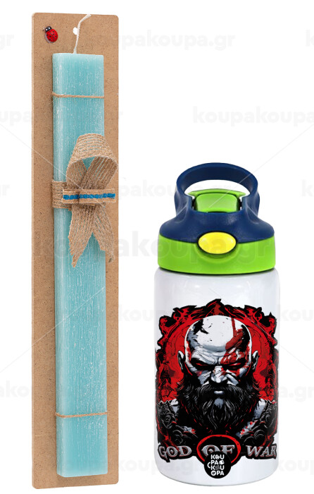God of war, Πασχαλινή Λαμπάδα με Παιδικό παγούρι θερμό, ανοξείδωτο, με καλαμάκι ασφαλείας, πράσινο/μπλε (350ml) & κερί αρωματικό πλακέ (30cm) (ΤΙΡΚΟΥΑΖ)