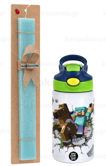Minecraft brick, Πασχαλινή Λαμπάδα με Παιδικό παγούρι θερμό, ανοξείδωτο, με καλαμάκι ασφαλείας, πράσινο/μπλε (350ml) & κερί αρωματικό πλακέ (30cm) (ΤΙΡΚΟΥΑΖ)