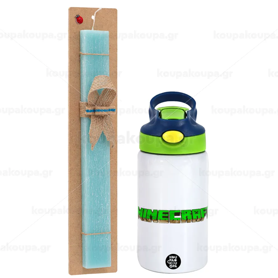 Minecraft logo green, Πασχαλινή Λαμπάδα με Παιδικό παγούρι θερμό, ανοξείδωτο, με καλαμάκι ασφαλείας, πράσινο/μπλε (350ml) & κερί αρωματικό πλακέ (30cm) (ΤΙΡΚΟΥΑΖ)