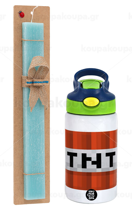 Minecraft TNT, Πασχαλινή Λαμπάδα με Παιδικό παγούρι θερμό, ανοξείδωτο, με καλαμάκι ασφαλείας, πράσινο/μπλε (350ml) & κερί αρωματικό πλακέ (30cm) (ΤΙΡΚΟΥΑΖ)