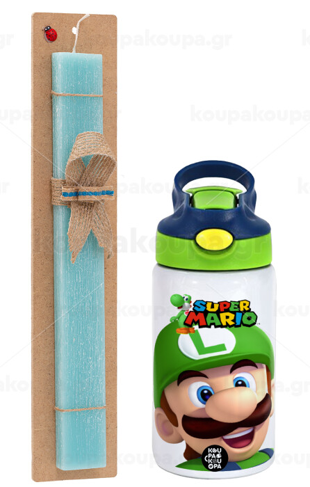 Super mario Luigi, Πασχαλινή Λαμπάδα με Παιδικό παγούρι θερμό, ανοξείδωτο, με καλαμάκι ασφαλείας, πράσινο/μπλε (350ml) & κερί αρωματικό πλακέ (30cm) (ΤΙΡΚΟΥΑΖ)