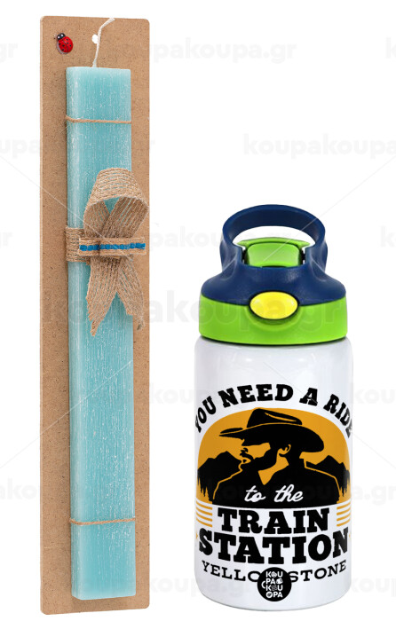You need a ride to the train station, Πασχαλινή Λαμπάδα με Παιδικό παγούρι θερμό, ανοξείδωτο, με καλαμάκι ασφαλείας, πράσινο/μπλε (350ml) & κερί αρωματικό πλακέ (30cm) (ΤΙΡΚΟΥΑΖ)