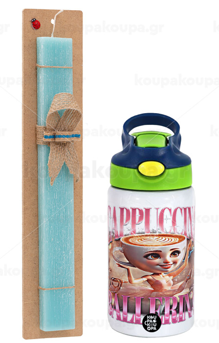 BALLERINA CAPUCHINA FUNK, Πασχαλινή Λαμπάδα με Παιδικό παγούρι θερμό, ανοξείδωτο, με καλαμάκι ασφαλείας, πράσινο/μπλε (350ml) & κερί αρωματικό πλακέ (30cm) (ΤΙΡΚΟΥΑΖ)