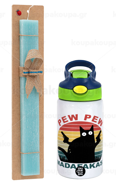 PEW PEW madafakas, Πασχαλινή Λαμπάδα με Παιδικό παγούρι θερμό, ανοξείδωτο, με καλαμάκι ασφαλείας, πράσινο/μπλε (350ml) & κερί αρωματικό πλακέ (30cm) (ΤΙΡΚΟΥΑΖ)