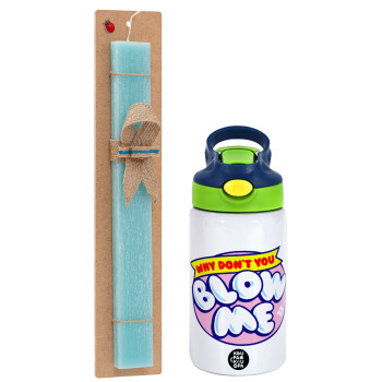 Why Don't You Blow Me Funny, Πασχαλινή Λαμπάδα με Παιδικό παγούρι θερμό, ανοξείδωτο, με καλαμάκι ασφαλείας, πράσινο/μπλε (350ml) & κερί αρωματικό πλακέ (30cm) (ΤΙΡΚΟΥΑΖ)