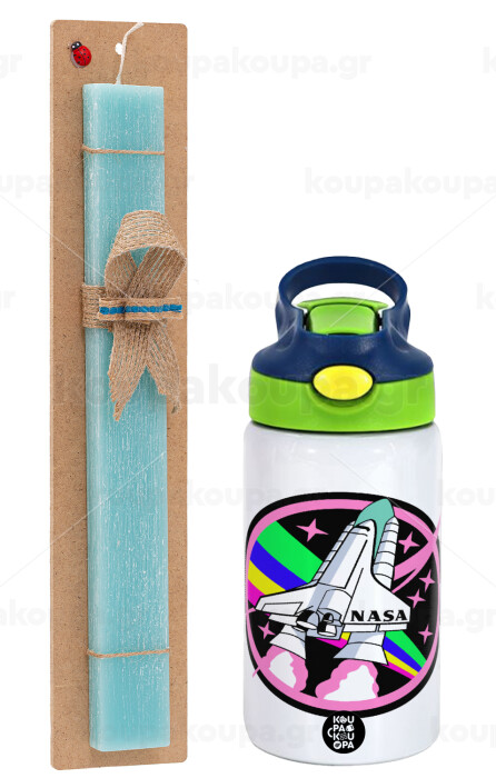 NASA pink, Πασχαλινή Λαμπάδα με Παιδικό παγούρι θερμό, ανοξείδωτο, με καλαμάκι ασφαλείας, πράσινο/μπλε (350ml) & κερί αρωματικό πλακέ (30cm) (ΤΙΡΚΟΥΑΖ)