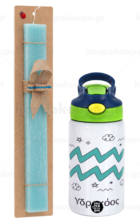 Ζώδια Υδροχόος, Πασχαλινή Λαμπάδα με Παιδικό παγούρι θερμό, ανοξείδωτο, με καλαμάκι ασφαλείας, πράσινο/μπλε (350ml) & κερί αρωματικό πλακέ (30cm) (ΤΙΡΚΟΥΑΖ)