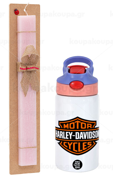 Motor Harley Davidson, Πασχαλινή Λαμπάδα με Παιδικό παγούρι θερμό, ανοξείδωτο, με καλαμάκι ασφαλείας, ροζ/μωβ (350ml) & κερί αρωματικό πλακέ (30cm) (ΡΟΖ)