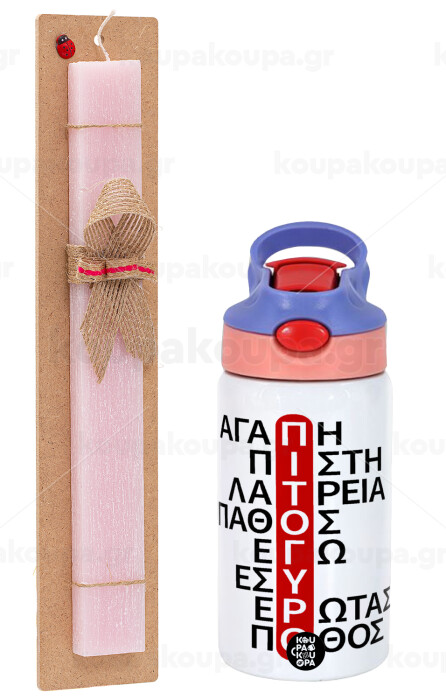 Πιτόγυρο πόθος, Πασχαλινή Λαμπάδα με Παιδικό παγούρι θερμό, ανοξείδωτο, με καλαμάκι ασφαλείας, ροζ/μωβ (350ml) & κερί αρωματικό πλακέ (30cm) (ΡΟΖ)