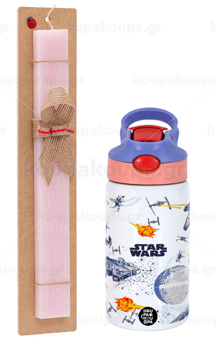 Ο πόλεμος των άστρων, Πασχαλινή Λαμπάδα με Παιδικό παγούρι θερμό, ανοξείδωτο, με καλαμάκι ασφαλείας, ροζ/μωβ (350ml) & κερί αρωματικό πλακέ (30cm) (ΡΟΖ)