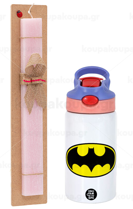 Batman, Πασχαλινή Λαμπάδα με Παιδικό παγούρι θερμό, ανοξείδωτο, με καλαμάκι ασφαλείας, ροζ/μωβ (350ml) & κερί αρωματικό πλακέ (30cm) (ΡΟΖ)