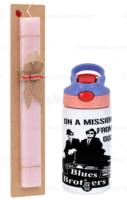 Blues brothers on a mission from God, Πασχαλινή Λαμπάδα με Παιδικό παγούρι θερμό, ανοξείδωτο, με καλαμάκι ασφαλείας, ροζ/μωβ (350ml) & κερί αρωματικό πλακέ (30cm) (ΡΟΖ)