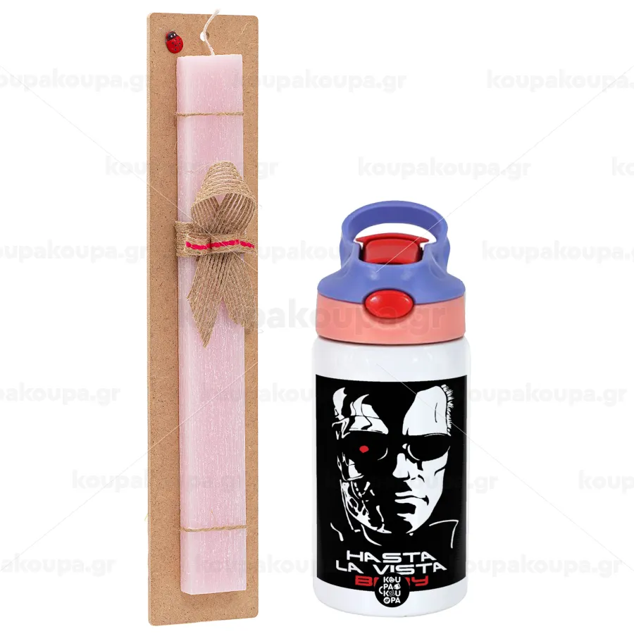 Terminator Hasta La Vista, Πασχαλινή Λαμπάδα με Παιδικό παγούρι θερμό, ανοξείδωτο, με καλαμάκι ασφαλείας, ροζ/μωβ (350ml) & κερί αρωματικό πλακέ (30cm) (ΡΟΖ)