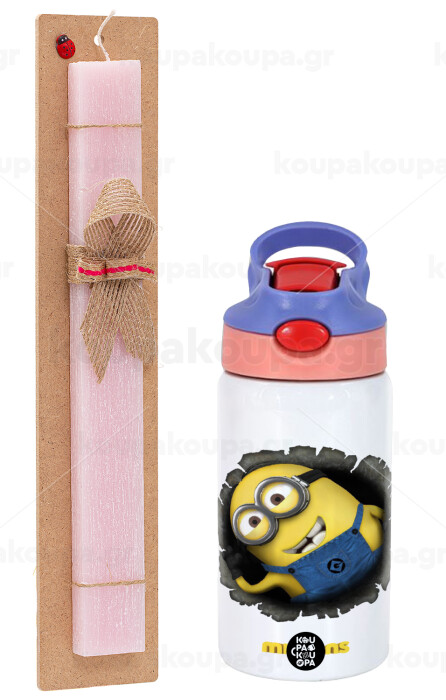 Minions hi, Πασχαλινή Λαμπάδα με Παιδικό παγούρι θερμό, ανοξείδωτο, με καλαμάκι ασφαλείας, ροζ/μωβ (350ml) & κερί αρωματικό πλακέ (30cm) (ΡΟΖ)