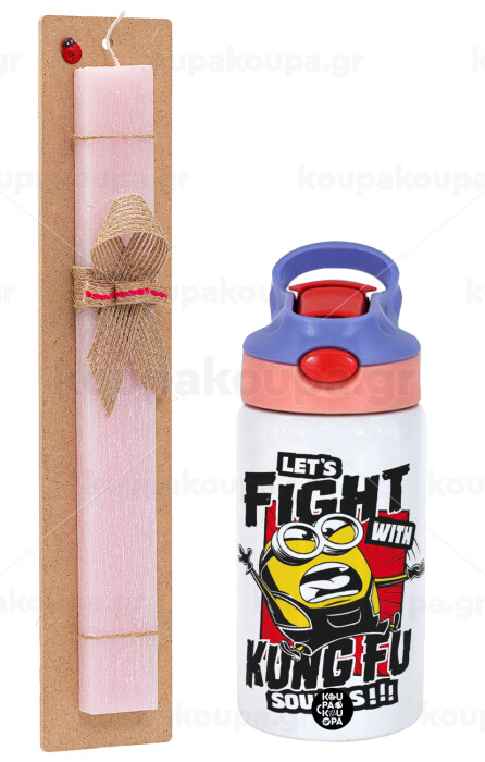 Minions Let's fight with kung fu sounds, Πασχαλινή Λαμπάδα με Παιδικό παγούρι θερμό, ανοξείδωτο, με καλαμάκι ασφαλείας, ροζ/μωβ (350ml) & κερί αρωματικό πλακέ (30cm) (ΡΟΖ)