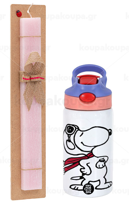Snoopy ο πιλότος, Πασχαλινή Λαμπάδα με Παιδικό παγούρι θερμό, ανοξείδωτο, με καλαμάκι ασφαλείας, ροζ/μωβ (350ml) & κερί αρωματικό πλακέ (30cm) (ΡΟΖ)