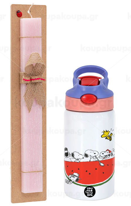 Snoopy summer, Πασχαλινή Λαμπάδα με Παιδικό παγούρι θερμό, ανοξείδωτο, με καλαμάκι ασφαλείας, ροζ/μωβ (350ml) & κερί αρωματικό πλακέ (30cm) (ΡΟΖ)