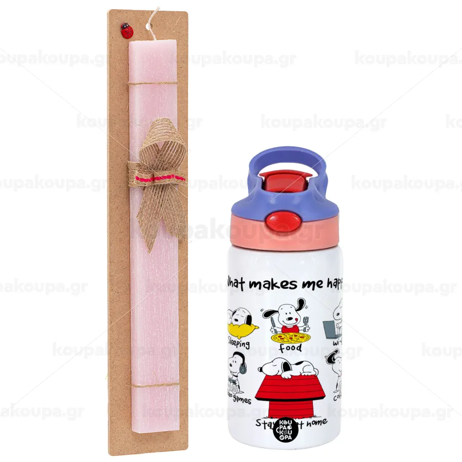 Snoopy what makes my happy, Πασχαλινή Λαμπάδα με Παιδικό παγούρι θερμό, ανοξείδωτο, με καλαμάκι ασφαλείας, ροζ/μωβ (350ml) & κερί αρωματικό πλακέ (30cm) (ΡΟΖ)