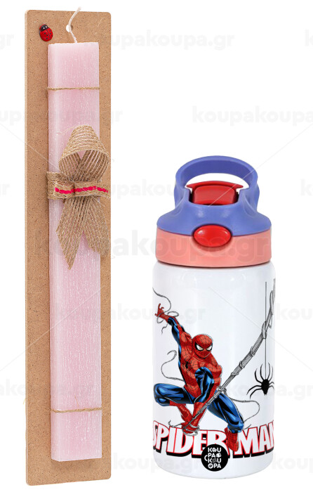 Spiderman fly, Πασχαλινή Λαμπάδα με Παιδικό παγούρι θερμό, ανοξείδωτο, με καλαμάκι ασφαλείας, ροζ/μωβ (350ml) & κερί αρωματικό πλακέ (30cm) (ΡΟΖ)