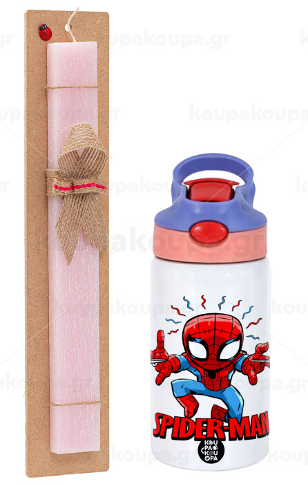 Spiderman flying, Πασχαλινή Λαμπάδα με Παιδικό παγούρι θερμό, ανοξείδωτο, με καλαμάκι ασφαλείας, ροζ/μωβ (350ml) & κερί αρωματικό πλακέ (30cm) (ΡΟΖ)