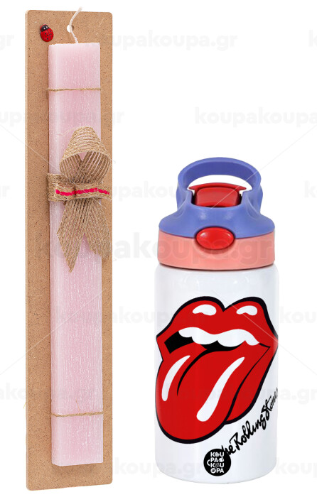 The rolling stones, Πασχαλινή Λαμπάδα με Παιδικό παγούρι θερμό, ανοξείδωτο, με καλαμάκι ασφαλείας, ροζ/μωβ (350ml) & κερί αρωματικό πλακέ (30cm) (ΡΟΖ)