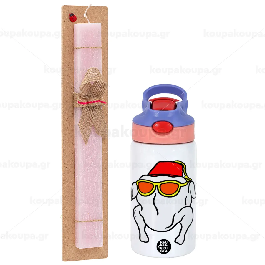 Friends turkey, Πασχαλινή Λαμπάδα με Παιδικό παγούρι θερμό, ανοξείδωτο, με καλαμάκι ασφαλείας, ροζ/μωβ (350ml) & κερί αρωματικό πλακέ (30cm) (ΡΟΖ)
