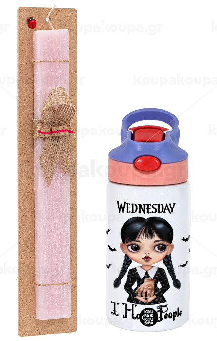 Wednesday Adams, i hate people, Πασχαλινή Λαμπάδα με Παιδικό παγούρι θερμό, ανοξείδωτο, με καλαμάκι ασφαλείας, ροζ/μωβ (350ml) & κερί αρωματικό πλακέ (30cm) (ΡΟΖ)
