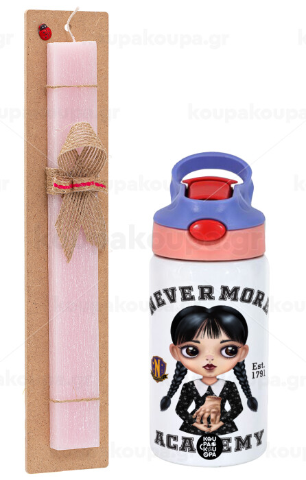 Wednesday Adams, nevermore, Πασχαλινή Λαμπάδα με Παιδικό παγούρι θερμό, ανοξείδωτο, με καλαμάκι ασφαλείας, ροζ/μωβ (350ml) & κερί αρωματικό πλακέ (30cm) (ΡΟΖ)