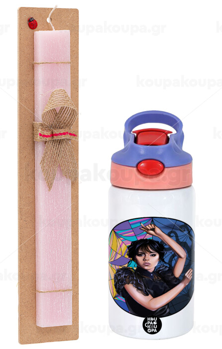 Wednesday dance, Πασχαλινή Λαμπάδα με Παιδικό παγούρι θερμό, ανοξείδωτο, με καλαμάκι ασφαλείας, ροζ/μωβ (350ml) & κερί αρωματικό πλακέ (30cm) (ΡΟΖ)