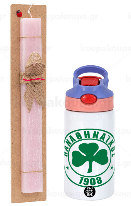 ΠΑΟ Παναθηναϊκός, Πασχαλινή Λαμπάδα με Παιδικό παγούρι θερμό, ανοξείδωτο, με καλαμάκι ασφαλείας, ροζ/μωβ (350ml) & κερί αρωματικό πλακέ (30cm) (ΡΟΖ)
