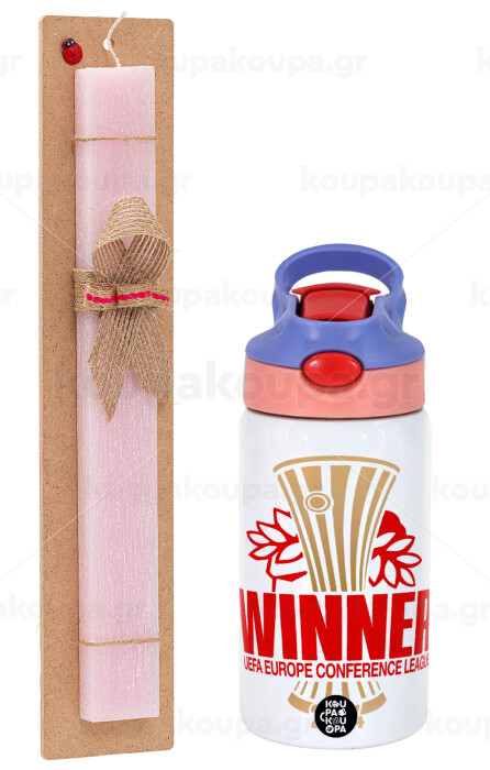 Europa Conference League WINNER, Πασχαλινή Λαμπάδα με Παιδικό παγούρι θερμό, ανοξείδωτο, με καλαμάκι ασφαλείας, ροζ/μωβ (350ml) & κερί αρωματικό πλακέ (30cm) (ΡΟΖ)