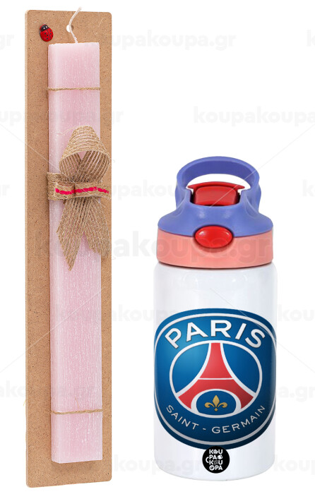 Paris Saint-Germain F.C., Πασχαλινή Λαμπάδα με Παιδικό παγούρι θερμό, ανοξείδωτο, με καλαμάκι ασφαλείας, ροζ/μωβ (350ml) & κερί αρωματικό πλακέ (30cm) (ΡΟΖ)