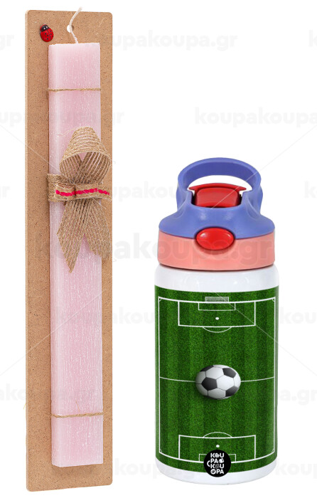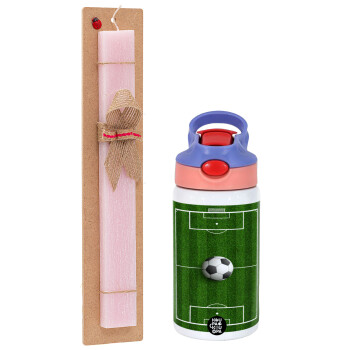 Soccer field, Γήπεδο ποδοσφαίρου, Πασχαλινή Λαμπάδα με Παιδικό παγούρι θερμό, ανοξείδωτο, με καλαμάκι ασφαλείας, ροζ/μωβ (350ml) & κερί αρωματικό πλακέ (30cm) (ΡΟΖ)