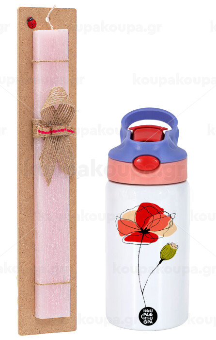 Red poppy flowers papaver, Πασχαλινή Λαμπάδα με Παιδικό παγούρι θερμό, ανοξείδωτο, με καλαμάκι ασφαλείας, ροζ/μωβ (350ml) & κερί αρωματικό πλακέ (30cm) (ΡΟΖ)