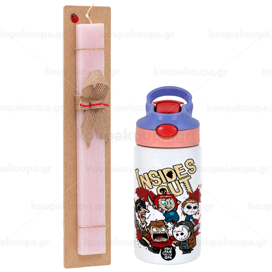 Halloween Inside out, Πασχαλινή Λαμπάδα με Παιδικό παγούρι θερμό, ανοξείδωτο, με καλαμάκι ασφαλείας, ροζ/μωβ (350ml) & κερί αρωματικό πλακέ (30cm) (ΡΟΖ)