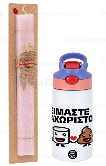 Είμαστε αχώριστοι, Πασχαλινή Λαμπάδα με Παιδικό παγούρι θερμό, ανοξείδωτο, με καλαμάκι ασφαλείας, ροζ/μωβ (350ml) & κερί αρωματικό πλακέ (30cm) (ΡΟΖ)