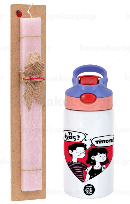 Τι έχεις? Τίποτα!, Πασχαλινή Λαμπάδα με Παιδικό παγούρι θερμό, ανοξείδωτο, με καλαμάκι ασφαλείας, ροζ/μωβ (350ml) & κερί αρωματικό πλακέ (30cm) (ΡΟΖ)