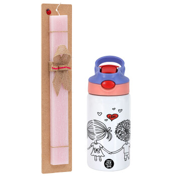 Hold my hand for ever, Πασχαλινή Λαμπάδα με Παιδικό παγούρι θερμό, ανοξείδωτο, με καλαμάκι ασφαλείας, ροζ/μωβ (350ml) & κερί αρωματικό πλακέ (30cm) (ΡΟΖ)